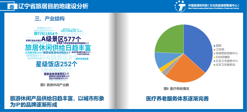 辽宁旅游休闲产品供给日趋丰富。辽宁拥有足够容纳旅居者的饭店、民宿、自有房产等生活空间,有文化馆、博物馆、公共图书馆、旅游景区、国家级、省级重点村镇、国家级旅游度假区等文化场所。医疗养老服务体系逐渐完善。全省医疗组织共34136家,其中涵盖医院、卫生院、疾病防控中心、妇幼保健院、社区卫生服务中心、卫生组织、就医床位等覆盖城乡的医疗卫生服务设施,为社区生活给予稳定就医环境。