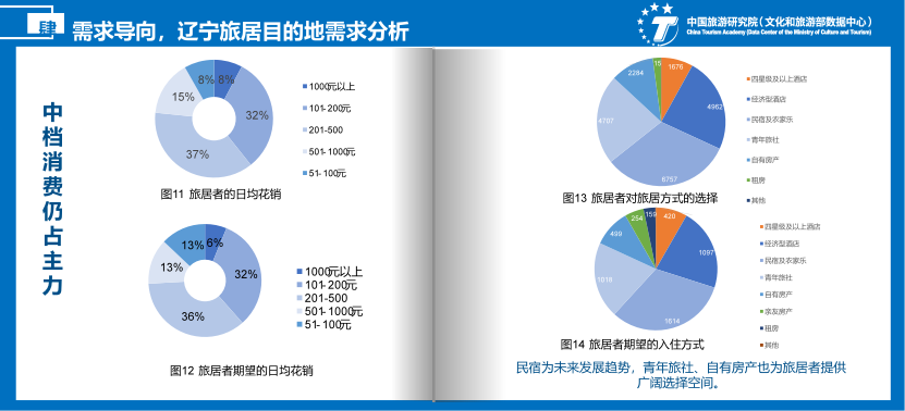 从旅居者日均消费的角度:旅居者的消费水平不断升级,追求精致化、多样化的旅居生活群体逐渐增多。调查问卷显示,消费者的日均消费集中在101-200,201-500元之间;在未来,应更加注重打造高质量的民宿集群、休闲购物中心,打造便于旅居者分层次、多样化、精致化的生活和消费场所;一个月、一至两个月的旅居时长最能体现旅居者对辽宁旅居在时间上的需求,长时间停留对旅居者吸引力不足;从住宿方式的角度:旅居者的住宿方式由酒店向民宿变革,为旅居者未来趋于选择的居住方式、青年旅社、酒店和自有房产给予广阔选择空间。