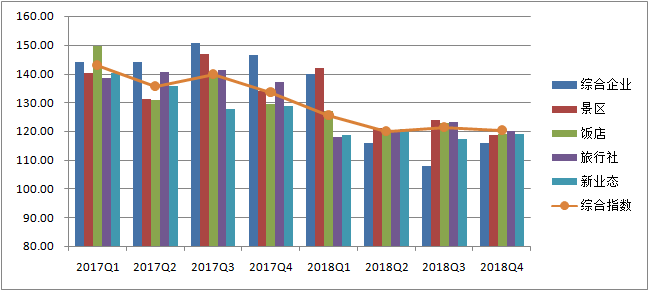 产业运行较为景气。2018年全年,受企业家信心、产品价格、营业收入、营业成本等方面不利预期影响,各季度旅游产业景气指数分别为125.5、120.0、121.4和120.35,与去年同期下降,但仍然在“较为景气”区间运行。从分行业景气指数来看,旅游景区、旅游住宿和旅游新业态明显好于旅游集团和传统旅行社。从产业要素和开展动能来看,从业人员、固定资产投资仍然保持增长趋势。
