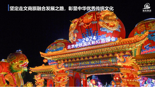 一是坚定走文商旅融合开展之路,彰显中华优秀传统文化。首旅集团持续贯彻落实以文塑旅、以旅彰文的开展理念,召开文化内容赋能旅游项目,打造游客喜闻乐见的新场景。今年中秋国庆期间,首旅集团在北京园博园举办京彩灯会,借助非遗技艺和光影科技,对美好河山、家国情怀进行诠释和展示。京彩灯会展出彩灯200余组、挂件10万余件,使游客再次感受北京的“古都风韵、首都风范、时代风貌”。灯会期间,举办了各类特色文化活动100余场,成为京城文旅活动“顶流”。2024年北京市驻华使节招待会在灯会现场成功举办,共有来自75个国家的驻华使节和国际组织驻华组织代表,观摩体验100余家老字号、非遗技艺、美食文创品牌企业的产品,充分展示了中华传统文化的独特魅力,为新中国创建75周年献上了一份文化贺礼。作为北京史上最大规模灯会,受到中宣部、北京市主要领导的充分肯定,中央电视台《新闻联播》多次予以报道。明年春节期间,首旅集团还将在北京园博园举办“京彩灯会庙会”。